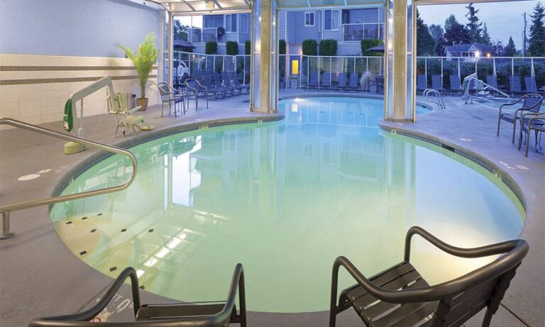 - Pool and hot tub hours are 8 a.m.-10 p.m. The heated indoor/outdoor pool and hot tub are open year-round. The fitness center pool is seasonal, closed November-April annually. Children who are not fully potty trained must wear swim diapers. There are no lifeguards on duty. Please refer to posted pool signage for additional specific information.